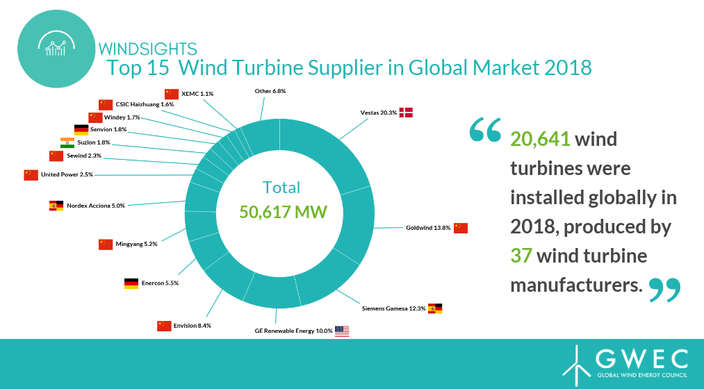 雖然維斯塔斯,西門(mén)子歌美颯和通用電氣可再生能源等知名公司占據(jù)了前五位,但GWEC的報(bào)告顯示,2018年前15大風(fēng)電機(jī)制造商中有一半以上位于中國(guó)。