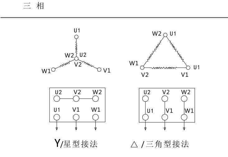 從上圖可以看出有兩種接線方法,這是針對(duì)不同的情況來(lái)設(shè)置的,3kw(包含3kw)以內(nèi)默認(rèn)的連接方式為Y型(右圖)、4kw(包含)以上的為△三角型接線方式(左圖),如果是特殊電壓的,如出口至國(guó)外的,拿不準(zhǔn)主意的,可以咨詢我們公司技術(shù)人員。