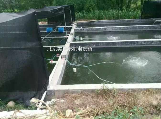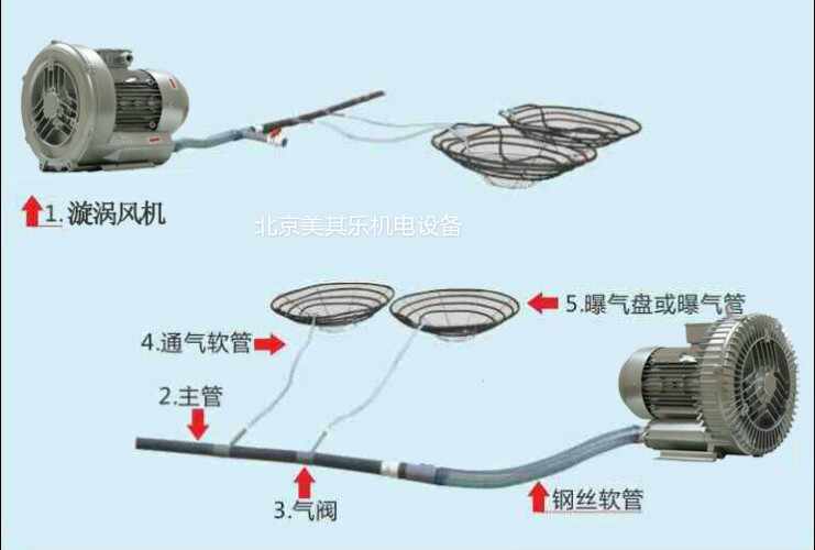 每畝配備功率0.2-0.5千瓦曝氣風機,盤可為60毫米或80直徑的鋼筋架子,曝氣管固定在框上,盤的總長度5米到7米,每畝裝3~4只,盤總長度約30米左右,這樣,架子離池底15~ 20厘米,可以防止淤泥堵塞管子。